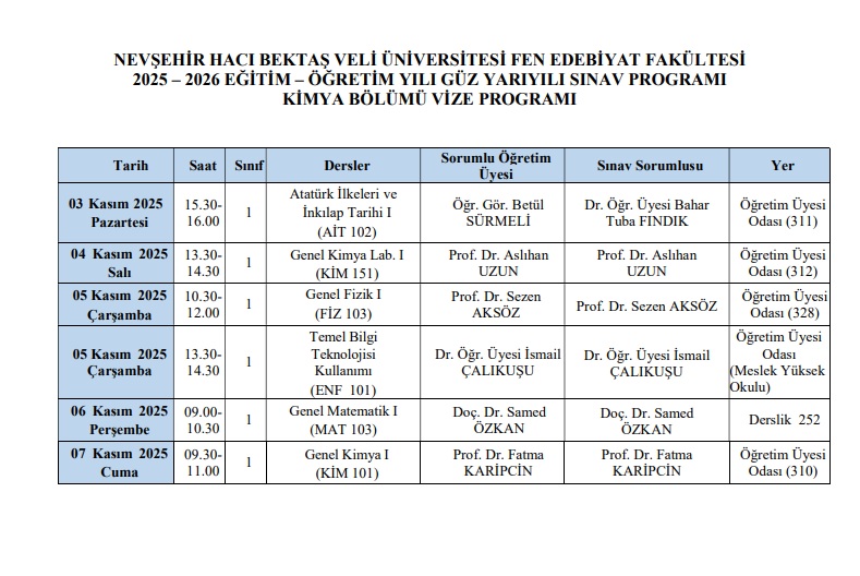 Kimya Bölümü 2025-2026 Güz Vize Programı